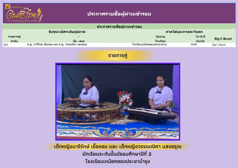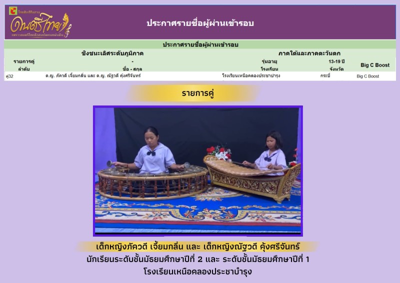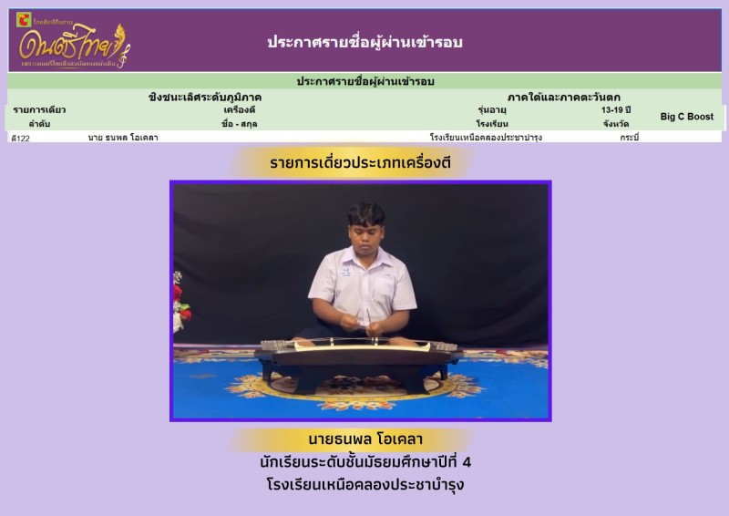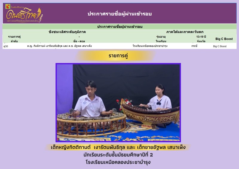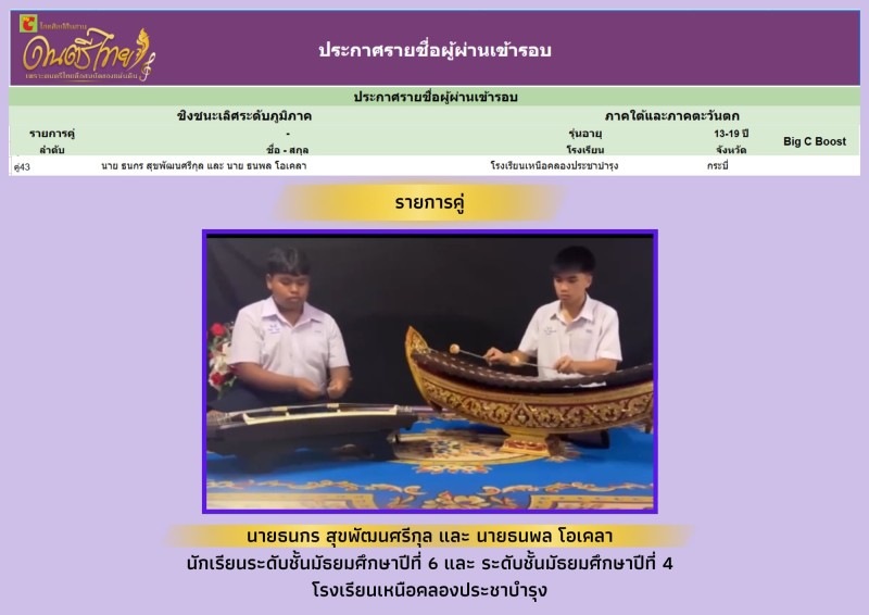 ในนามคณะผู้บริหาร คณะครู บุคลากรทางการศึกษาและนักเรียนโรงเรียนเหนือคลองประชาบำรุง ขอแสดงความยินดีกับตัวแทนนักเรียนเข้าร่วมประกวดดนตรีไทยในโครงการ Big C ดนตรีไทยปี 4 รอบคลิบวิดีโอและผ่านเข้ารอบระดับภูมิภาคใต้และภาคตะวันตก รายละเอียดมีดังนี้