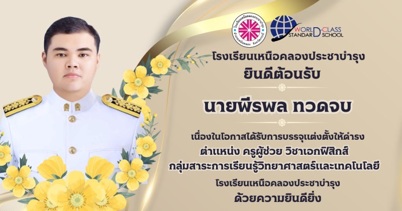 ในนามของคณะผู้บริหาร คณะครู บุคลากรทางการศึกษา และนักเรียนโรงเรียนเหนือคลองประชาบำรุง ขอแสดงความยินดีและต้อนรับ คุณครูพีรพล ทวดจบ ครูผู้ช่วย วิชาเอกฟิสิกส์ กลุ่มสาระการเรียนรู้วิทยาศาสตร์และเทคโนโลยี เข้าปฏิบัติหน้าที่ ณ โรงเรียนเหนือคลองประชาบำรุง