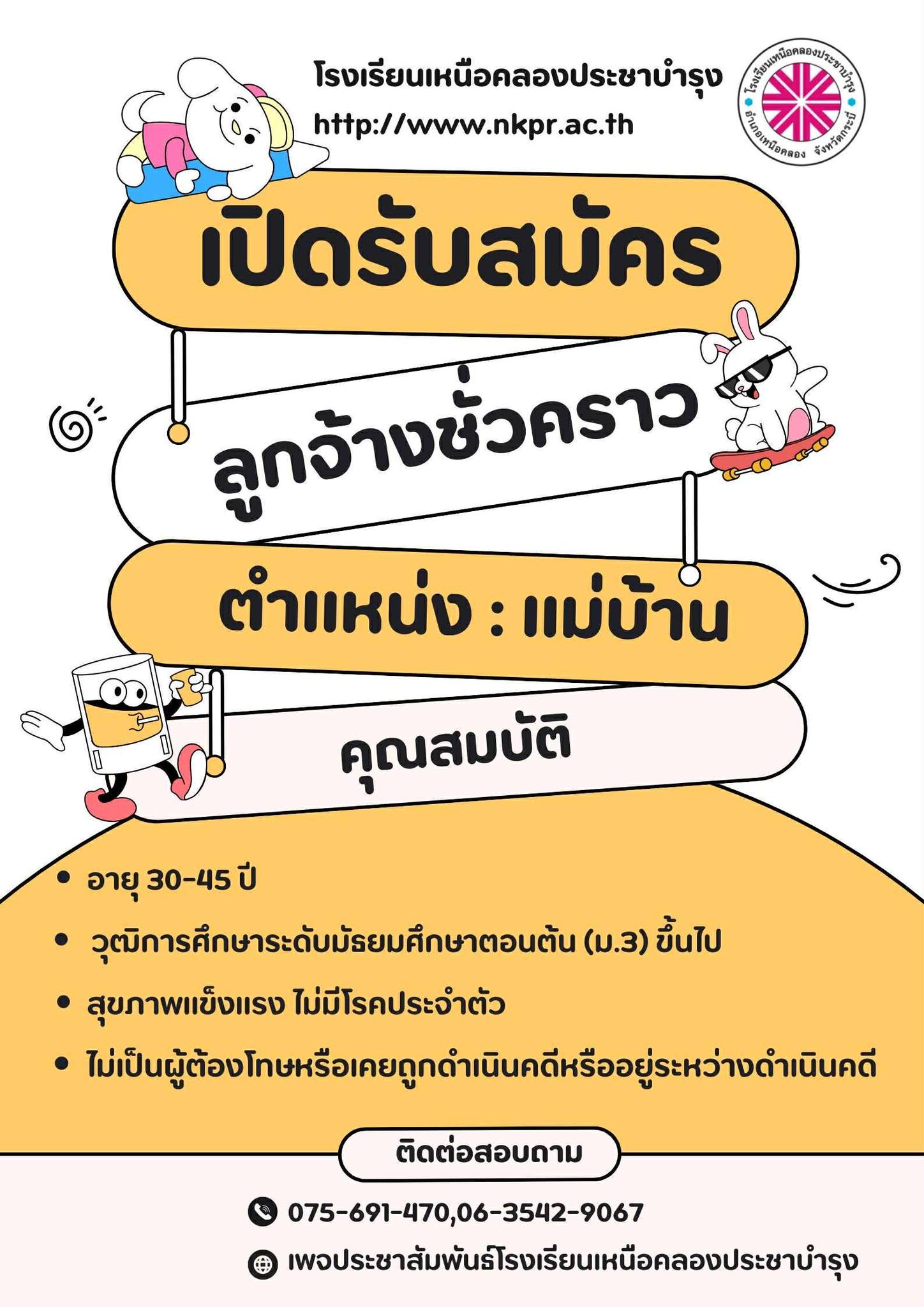 ประกาศโรงเรียนเหนือคลองประชาบำรุง เรื่อง การรับสมัครลูกจ้างชั่วคราว ตำแหน่ง แม่บ้าน